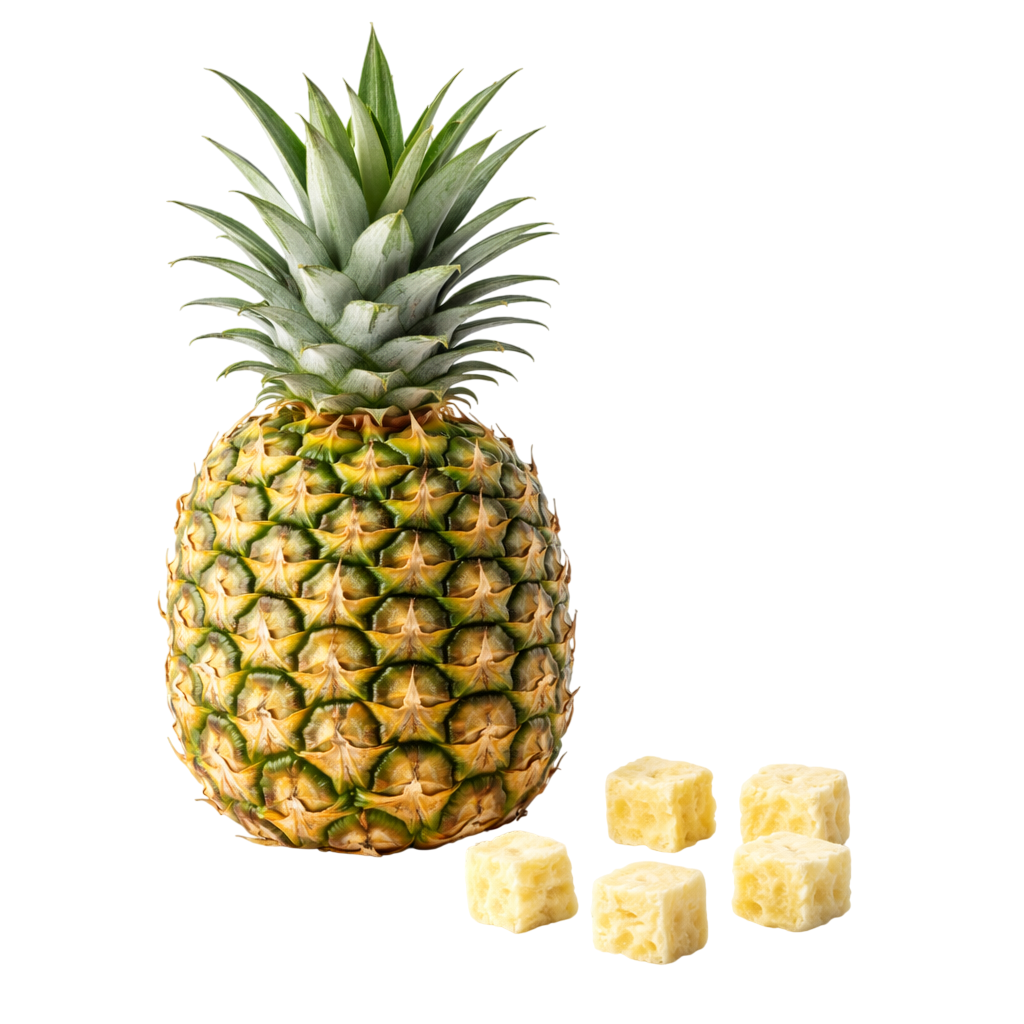 La piña es naturalmente fuente de vitamina C (apoya el sistema inmune), además aporta manganeso (relacionado con el metabolismo y la producción de energía) y compuestos antioxidantes propios de la fruta. También es conocida por contener bromelina, una enzima natural asociada tradicionalmente con el bienestar digestivo.