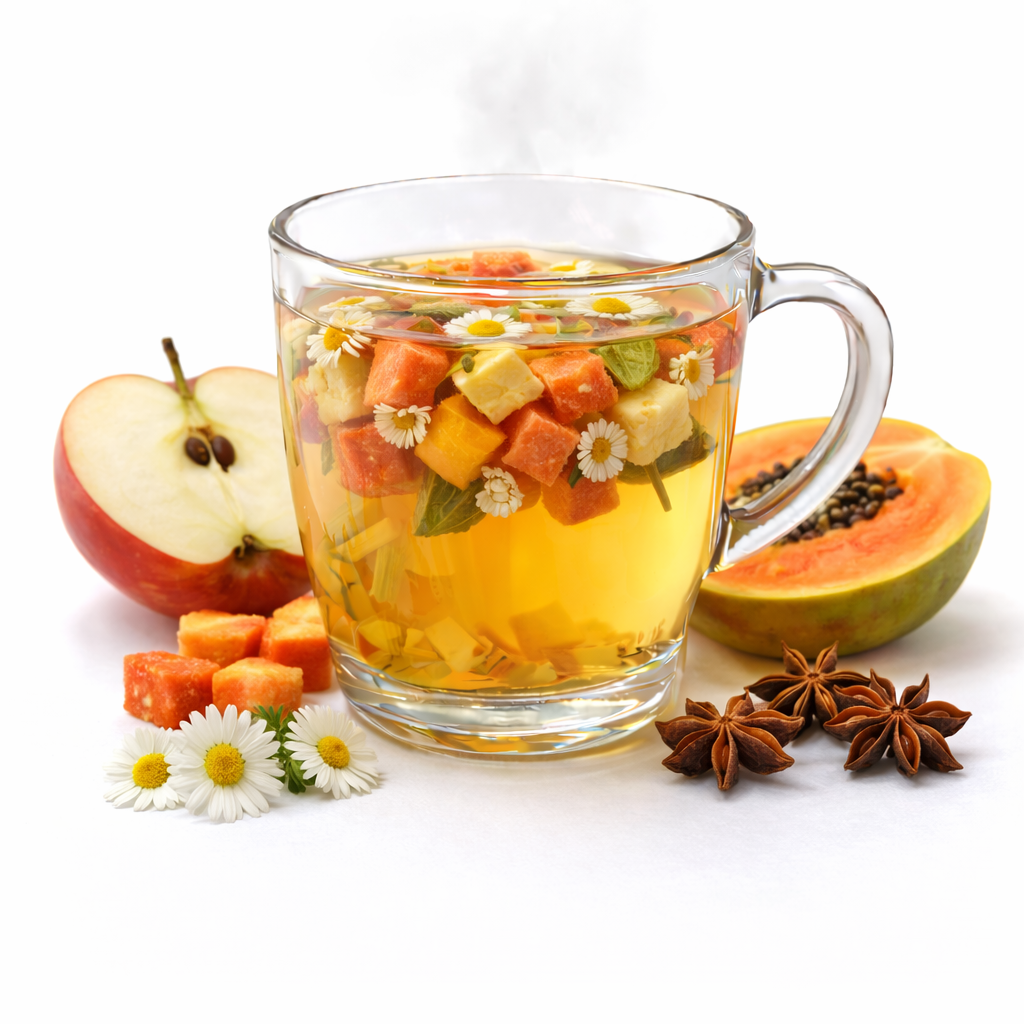 Rescate Suave está pensada para esos días en los que el estómago está sensible: cuando quieres algo tibio, sin acidez fuerte y con un perfil muy amable. La manzana y la papaya hacen una base frutal suave, y las hierbas tradicionales aportan ese “abrazo” digestivo que muchas personas buscan.